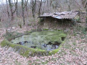 Le soleil faisait pourtant de gros efforts pour traverser l’épais tapis de nuages, les 30 marcheurs réunis à Cournou en étaient témoins, nous avons malheureusement gardé ce temps maussade tout au long de notre randonnée. Le circuit était prévu presque entièrement sur le plateau, sur un terrain pratiquement plat et sur de larges chemins, bordés par les chênes. Nous avons risqué une escapade hors sentier vers un dolmen que nous avons eu bien du mal à trouver et à reconnaitre. Nous avons fait d’autres trouvailles : des gariottes et surtout un ancien lavoir perdu au milieu de nulle part et surement juste utilisé par quelques animaux sauvages comme abreuvoir. Finalement les petites difficultés de ce parcours ont été : la descente vers Cels, sur un chemin caillouteux en forte inclinaison et, après avoir traversé le village, la remontée sur le plateau sur le même type de terrain mais avec la langue tirée. Pour finir le parcours, un léger crachin nous a accompagné jusqu’au refuge de nos voitures.
